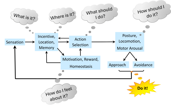 There are five critical computations for decision, in judging sensation and deciding what to do about it. The first four are: What is it? Where is it? How do I feel about it? What should I do? These computations generate sentient consciousness. The fifth is How should I do it? in terms of posture and locomotion. The final decision is sent to the circuits that control the muscles, and the results update the computational train. Nearly all animals do this, differing only in number and kinds of details that they handle.